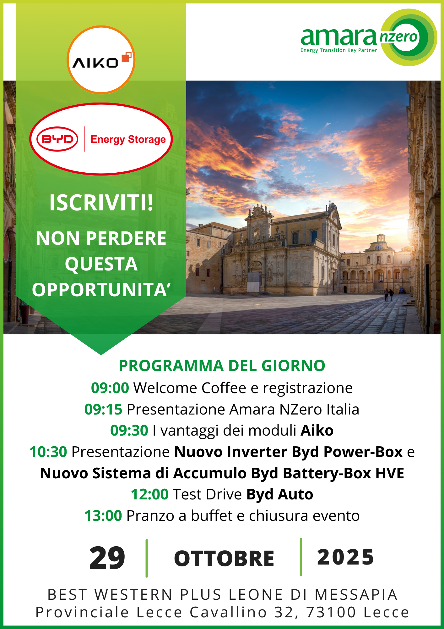 Partecipa anche tu al nostro prossimo Roadshow completamente GRATUITO che terremo in compagnia di AIKO e BYD a Lecce il prossimo 29 Ottobre 2025.